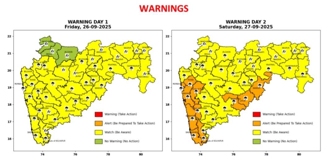 मराठवाडा ; नांदेड, लातूर, धाराशिव, हिंगोली, परभणी आणि बिड या जिल्ह्यात मुसळधार तर जालना आणि संभाजीनगर जिल्ह्यात हलक्या ते मध्यम पावसाचा यल्लो अलर्ट हवामान खात्याने जारी केला आहे.